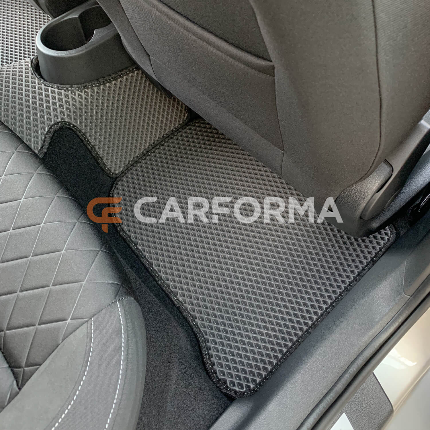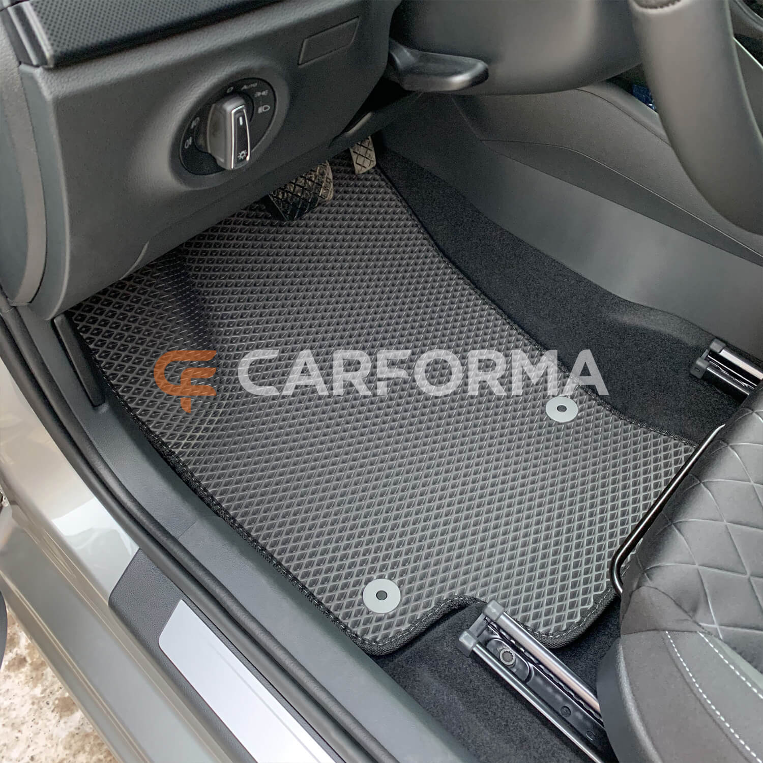 Автоковрики ЕВА не впитывают, а удерживают грязь в ячейках. Вода не катается по полу, как в резиновых половичках, однако, её все равно видно. ЕВА удобны тем, что их легко достать не пролив и вытряхнуть. Они дешевле.
