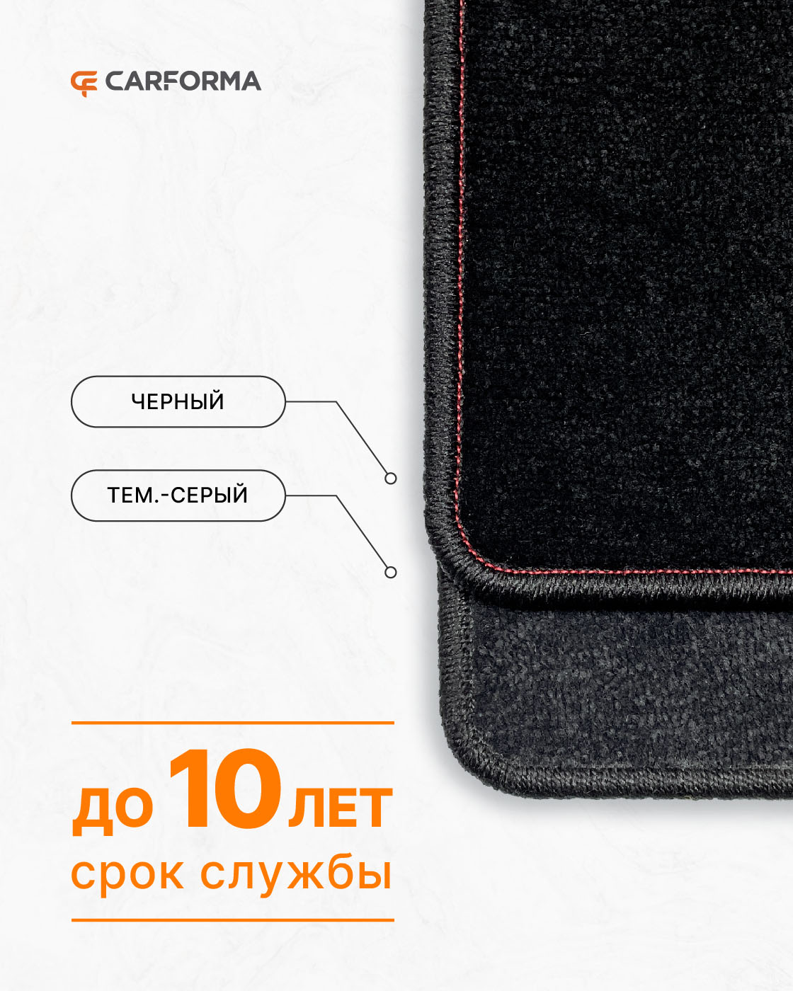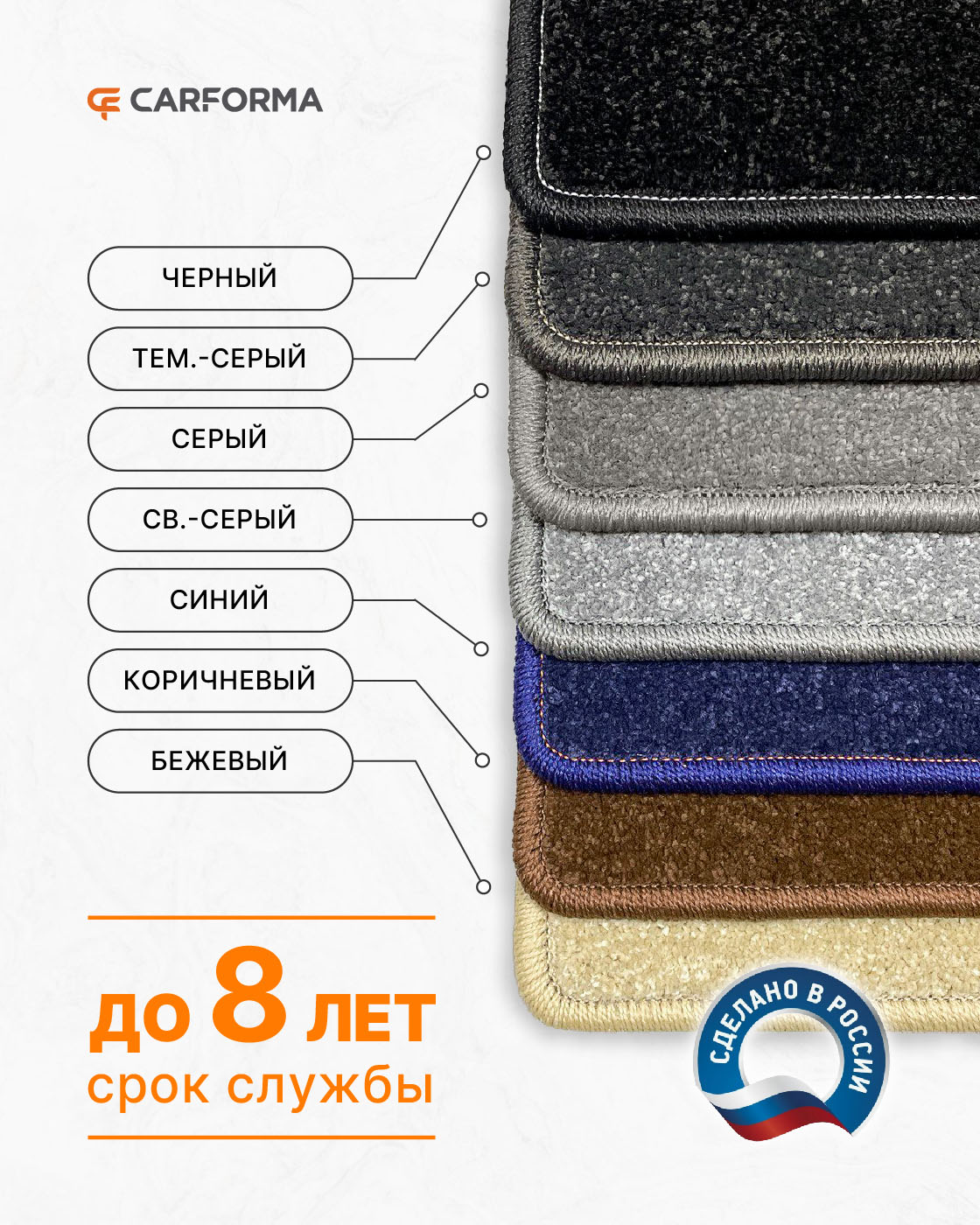 Ворсовые коврики CARFORMA имеют толщину 5, 8 или 10 мм в зависимости от ценовой категории.