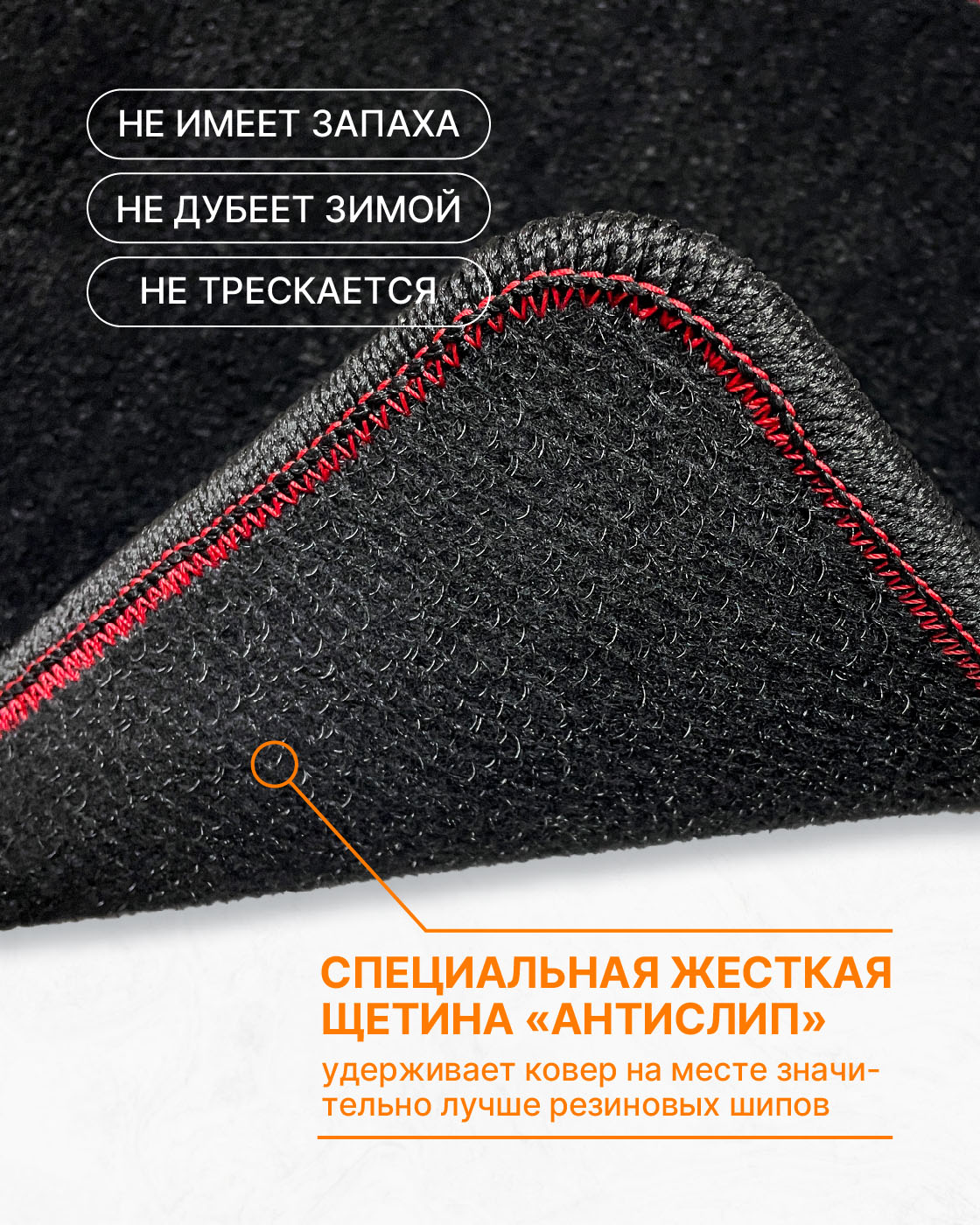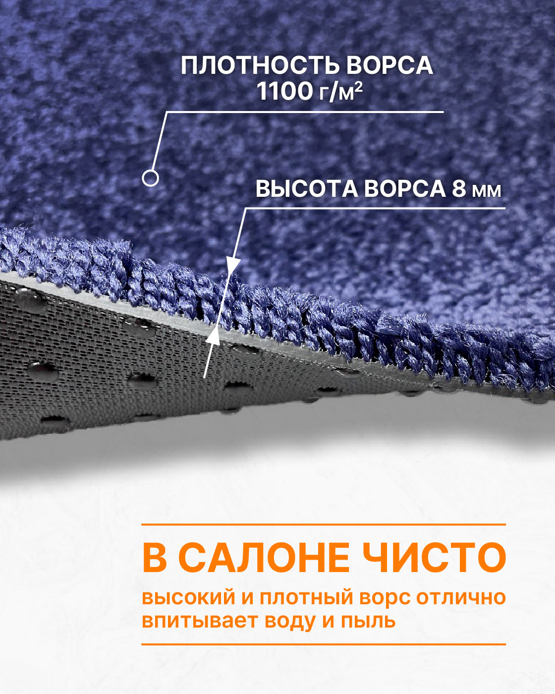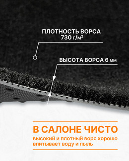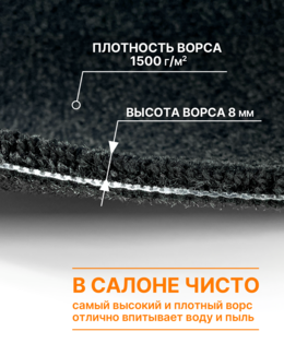 Ворсовые автоковрики впитывают пыль и воду, и удерживают ее внутри до следующей мойки. Удерживают много воды, не проливают её. Ворс - это максимальная чистота и уют при своевременной чистке.